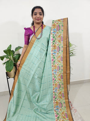Soft Semi Tussar Weaving with Kalamkari Border - Pastel Rama Green with Golden Yellow