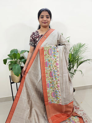 Soft Semi Tussar Weaving with Kalamkari Border - Grey with Honey Brown