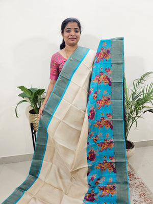 Pure Tussar Silk Saree with Zari Border - Cream with Blue