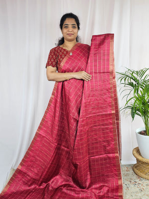 Soft Semi Tussar Checks Weaving with Kalamkari - Dark Pink