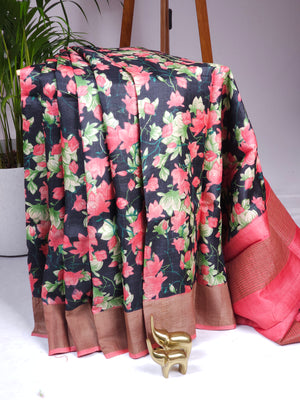 Pure Tussar Silk Saree with Zari Border - Black with Peach