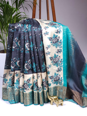 Pure Tussar Silk Saree with Zari Border - Black with Blue