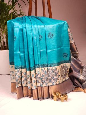 Pure Tussar Silk Saree with Zari Border - Blue with Black