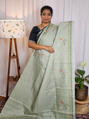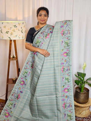 Soft Semi Tussar Weaving with Floral Border - Sea Green