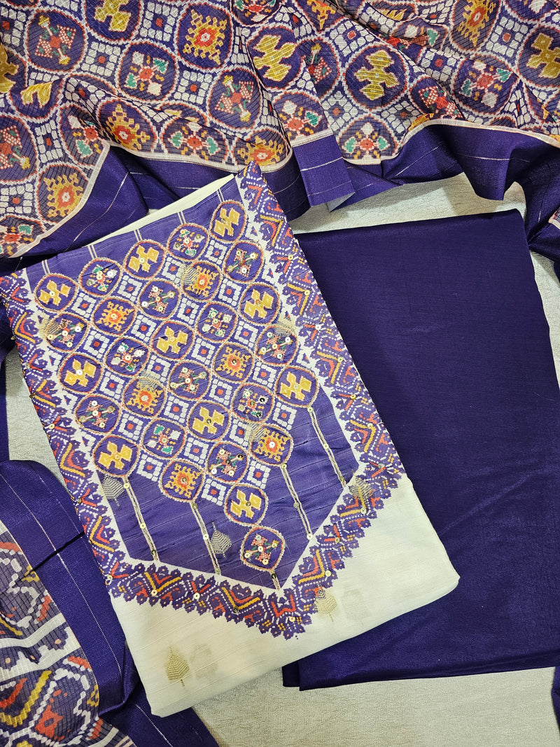 Premium Soft Cotton Unstitched Suit with Patch Work Neck - White with Yellow