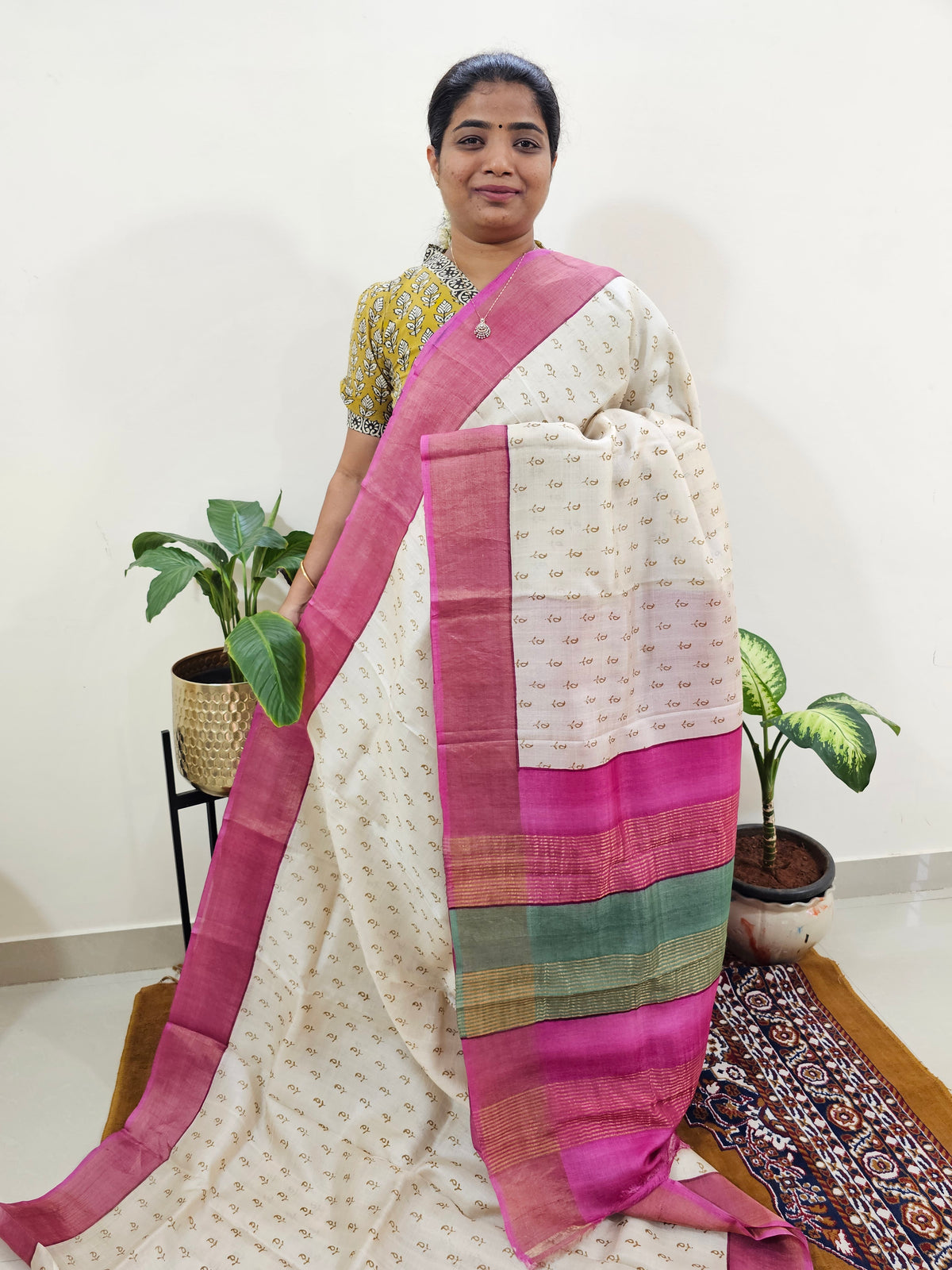 Pure Tussar Silk Saree with Zari Border - Off-white with Pink