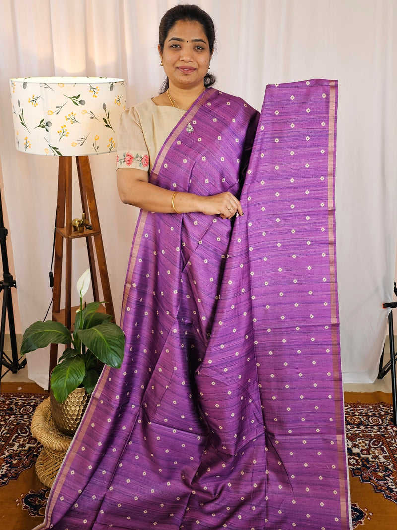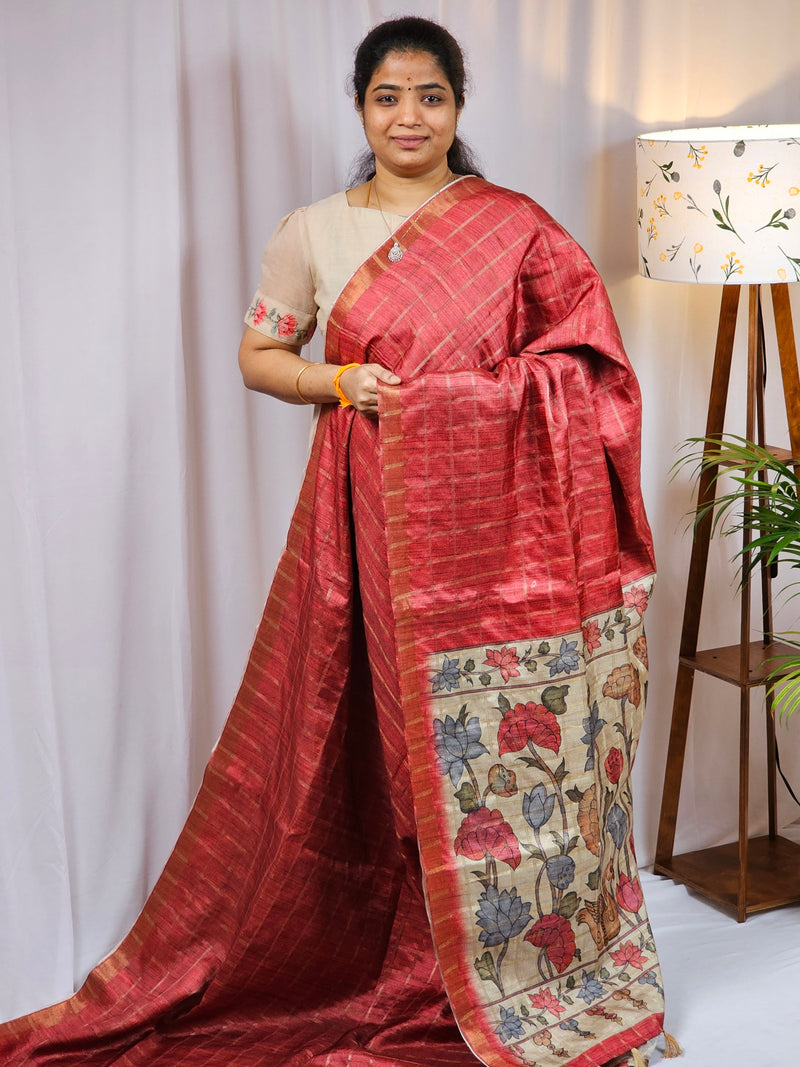Semi Tussar Sarees carries beautiful prints all over body like kalamkari , Kantha embroidery design in digital prints.