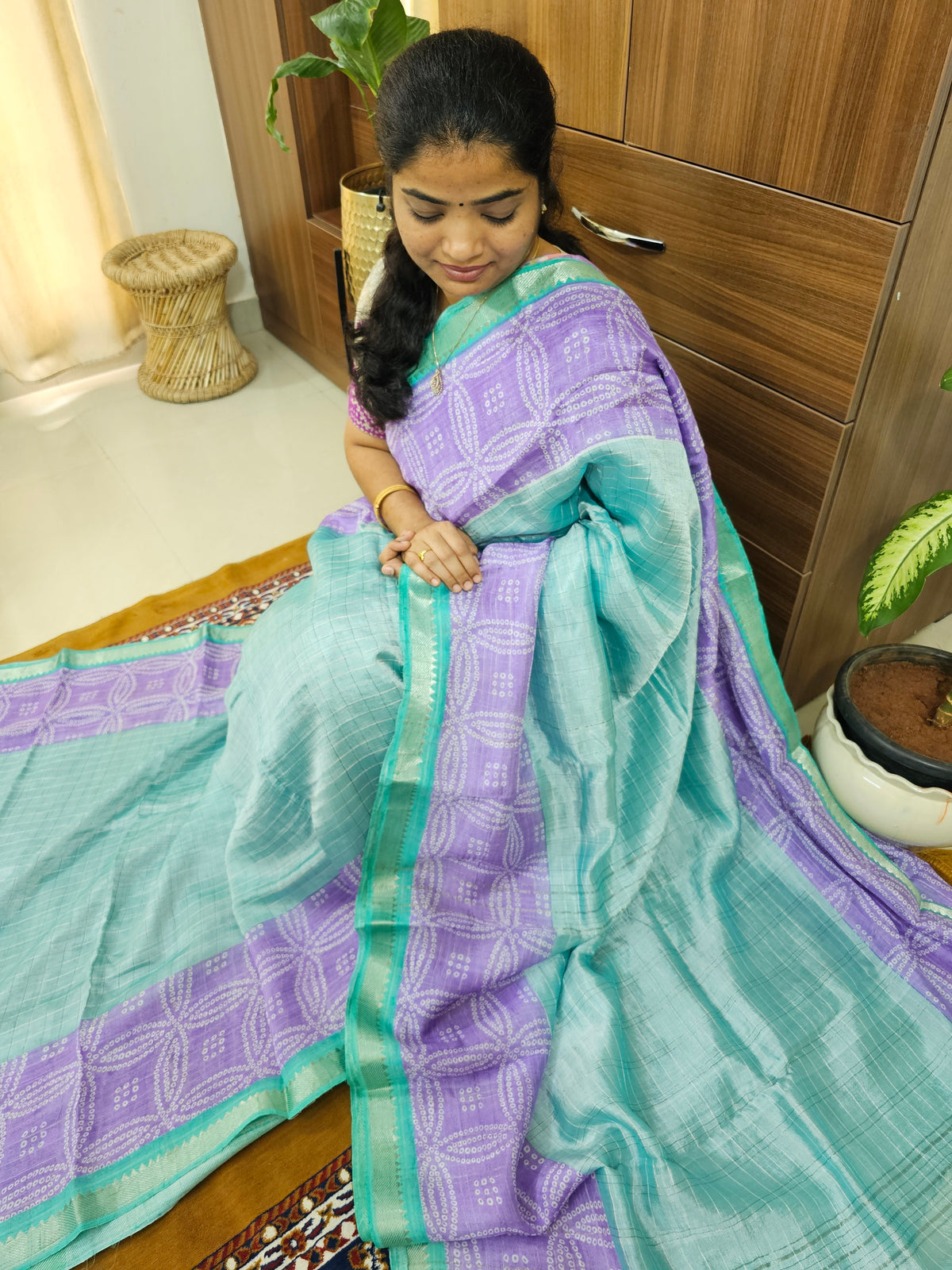Handwoven Mangalagiri Pattu saree with beautiful Bandhini digital prints, along with a running blouse