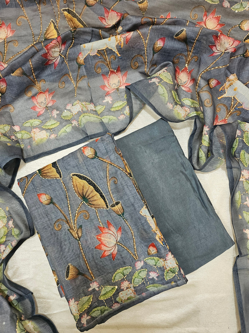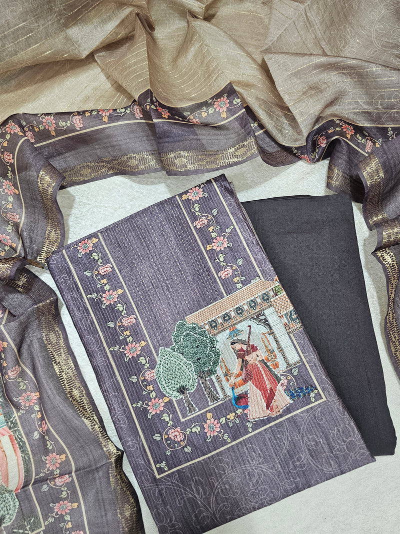 Chanderi with Katha Unstitched Salwar Suit - Dark Grey